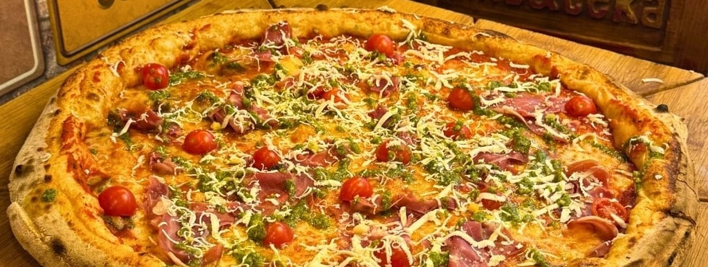 Disfruta nuestras pizzas XXL, (60 cm diámetro), elaboradas con ingredientes frescos y de calidad.